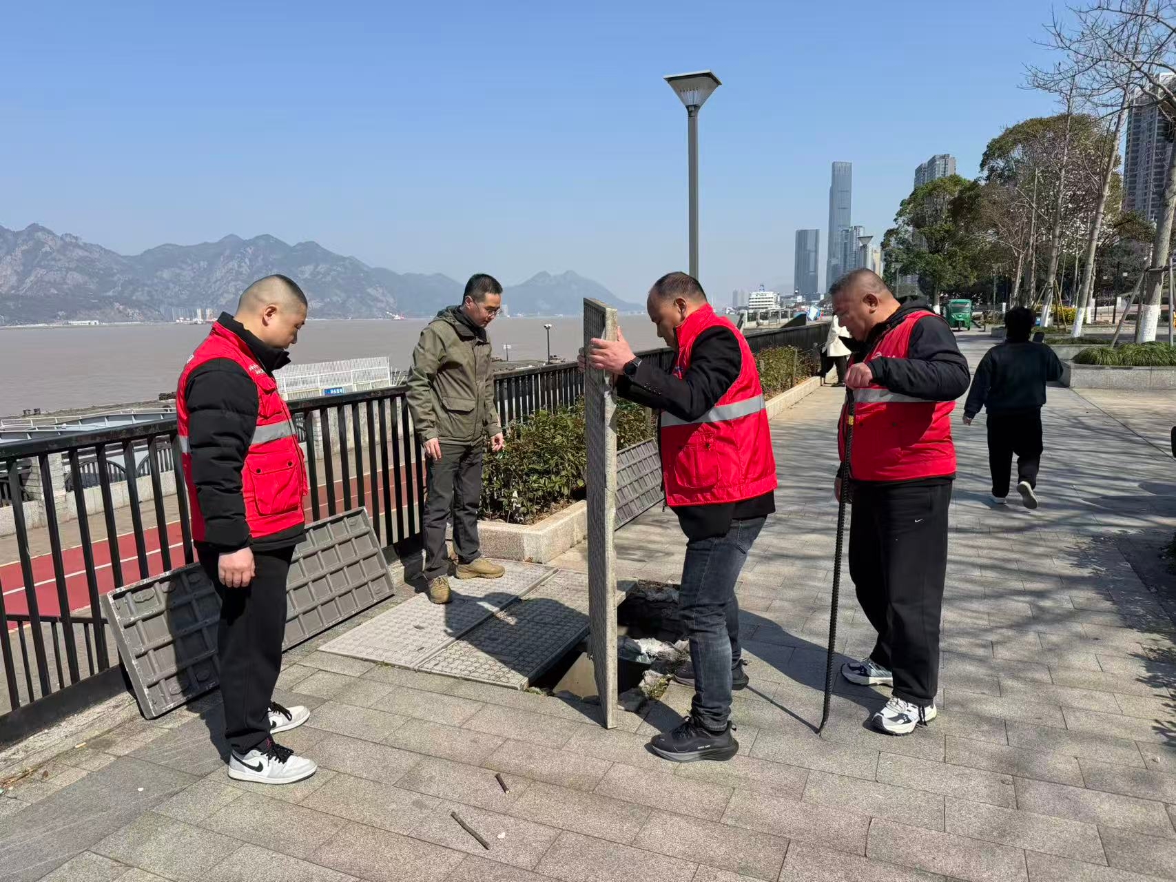 活动现场,志愿者们分工有序、热情高涨。他们手持工具,认真清扫码头周边道路与绿化带,不放过任何一处卫生死角。尤为引人注目的是,窨井盖更换工作正在紧张有序进行。部分下水道窨井盖因岁月侵蚀和频繁使用,出现了破损、松动等问题,如同隐藏在道路上的“陷阱”。志愿者们迅速行动,安全高效地更换破旧窨井盖,及时消除了潜在的安全隐患,为周边人员的出行安全筑牢了坚实防线。