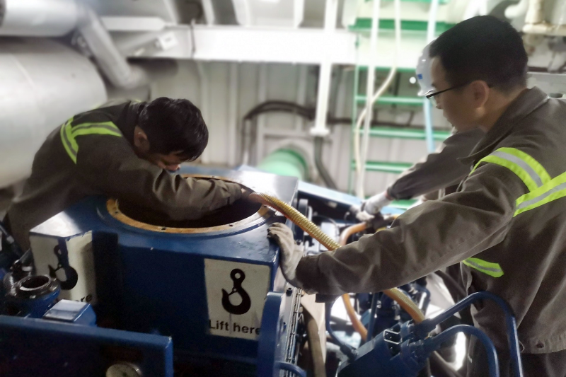 “温拖5”轮舵桨滑油已使用近6年,近期滑油出现泡沫现象,失去了原有的润滑、冷却作用。经检测,滑油部分工况数据已超标,更换滑油迫在眉睫。拖轮舵桨滑油的放油口在舵桨底部,常规换油需要进坞操作,为节省费用和时间,保障正常生产,设备技术部经理谢昌利决定自修。他立即召集部门人员商讨方案,反复研究舵桨图纸,最终确定采用上部抽油的方式。然而,上部抽油是应急抽油方式,操作复杂、工具缺乏、难度极大。设备部技术人员当机立断,决定自制专用工具,拆卸旋塞。由于吸油管径小,吸油速度慢,技术人员和“温拖5”轮轮机人员自发接力跟时间赛跑,确保任务不间断。经过两天时间的努力,滑油更换顺利完成。