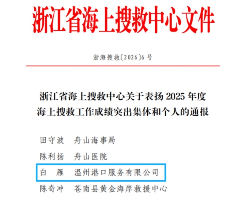 近日,浙江省海上搜救中心印发《关于表扬2025年度海上搜救工作成绩突出集体和个人的通报》,温州港口服务有限公司“温拖5”轮船长白雁凭借在海上应急救助中的突出表现,荣获“2025年度海上搜救工作成绩突出个人”称号。这是他继2022年获评同类荣誉后,再度获此殊荣,充分彰显了其过硬的专业素养与强烈的责任担当。
