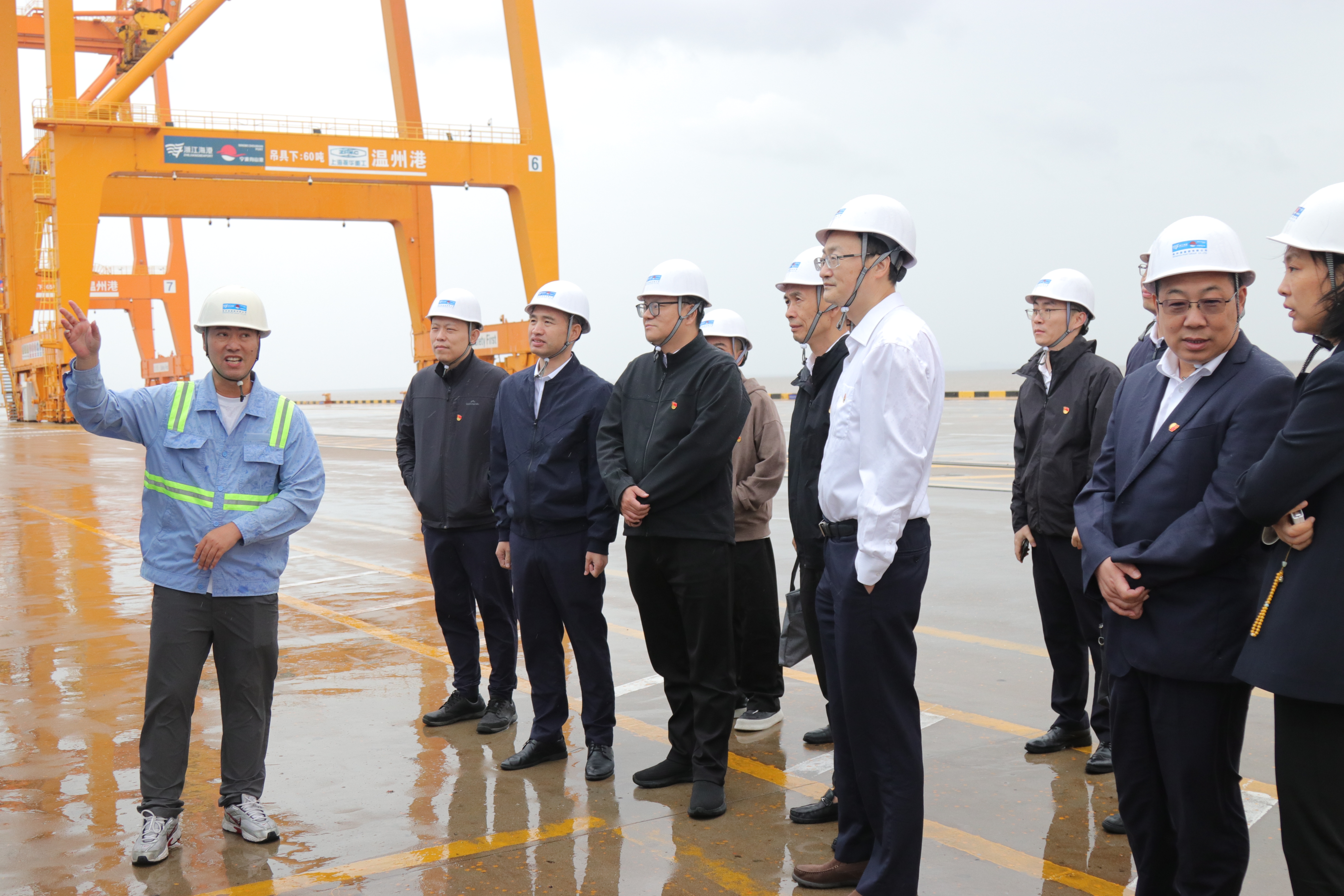 在状元岙港区8#泊位,周肖力一行参观了码头作业现场,听取了关于温州港概况、总体规划、生产经营等情况,以及状元岙港区规划、功能定位及业务开展情况的详细介绍。
